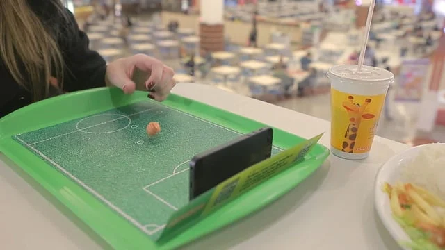 To bring more people to eat at Giraffas during the Brazilian World Cup in 2014 we created a mobile game that made their phone screens able to recognize the touch of a paper ball turning trays into a virtual soccer field. The catch: it could only be played at the chain's restaurants.