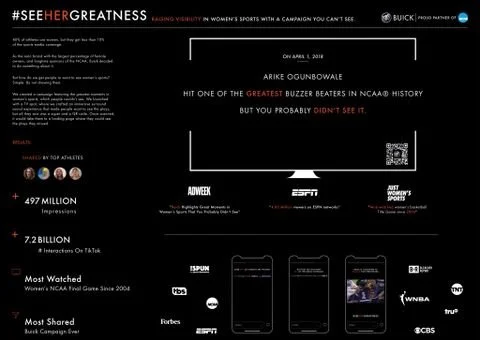 To demonstrate how little visibility female athletes get, we created a campaign featuring the greatest moments in women’s sports, which people couldn’t see. We launched with a TV spot, where we crafted an immersive surround sound experience that made people want to see the plays, but all they saw was a QR code and a super: